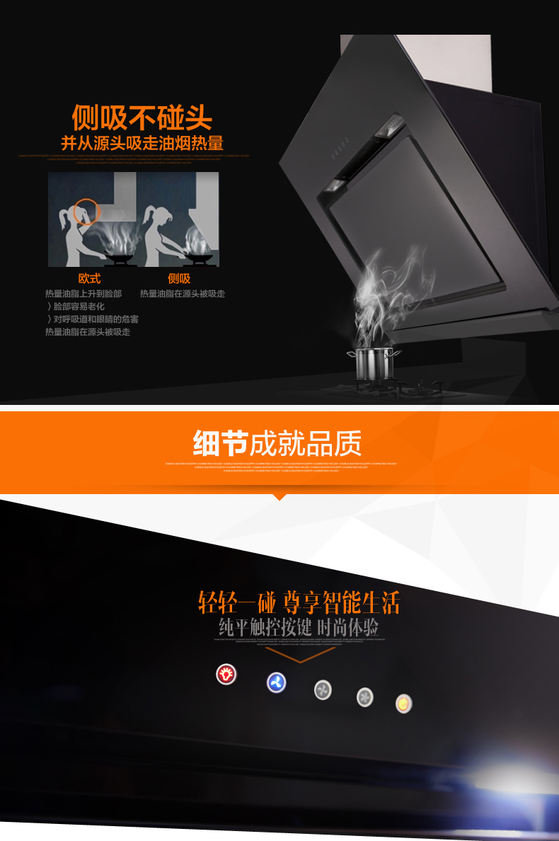 材質(zhì):黑晶鋼化玻璃 功能:側(cè)吸式 排風(fēng)量:16m3/min 噪音:≤53dB 操控:觸摸式 外形尺寸:900*370*830mm