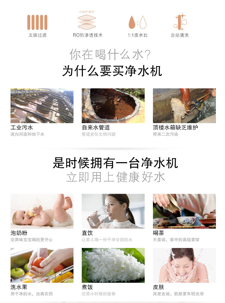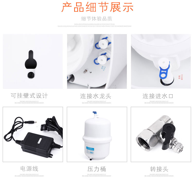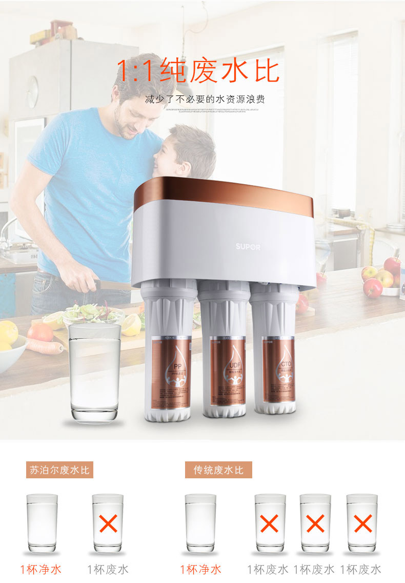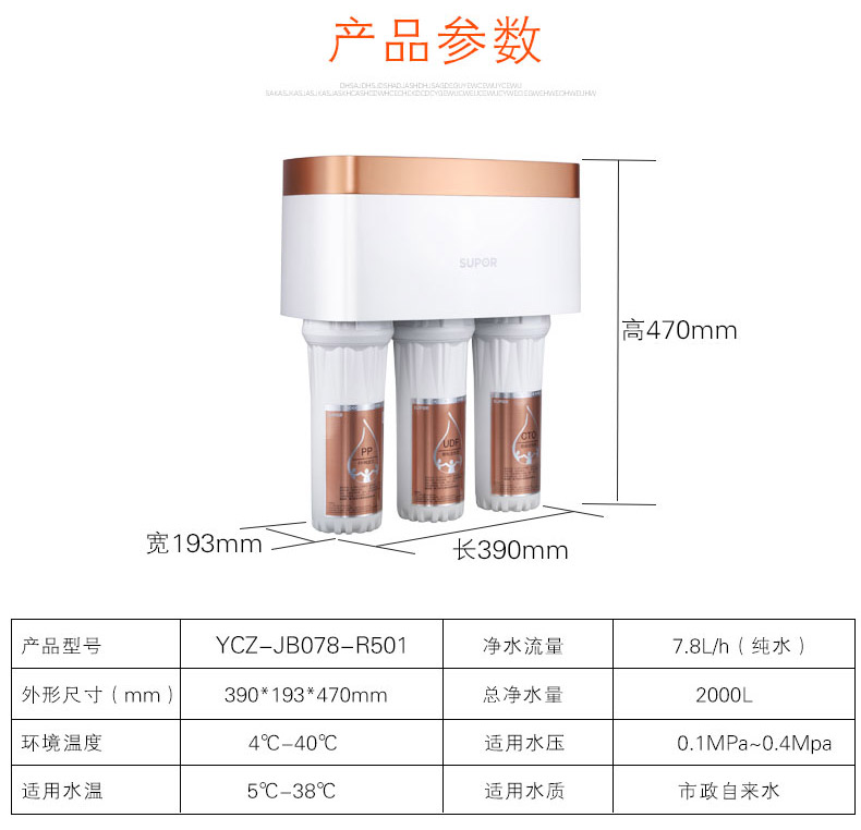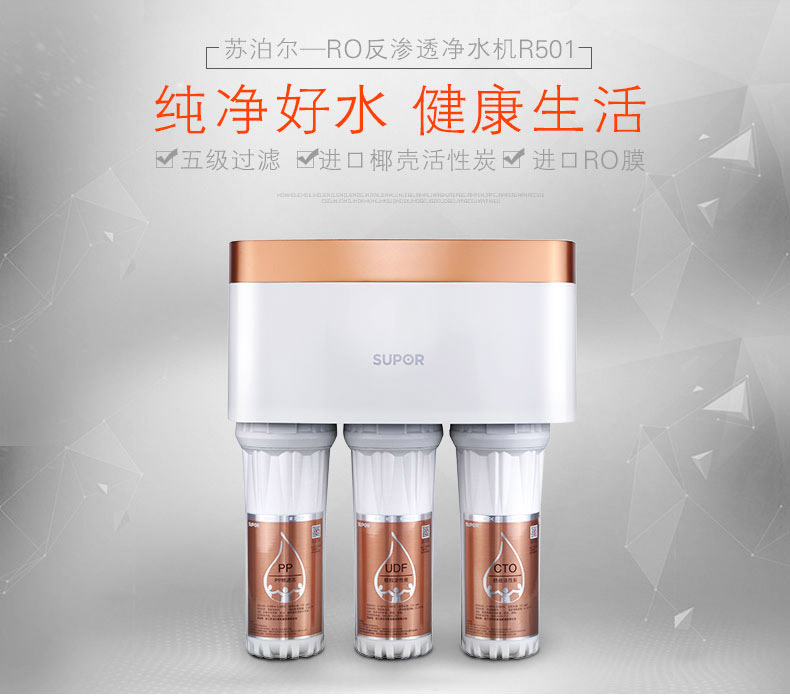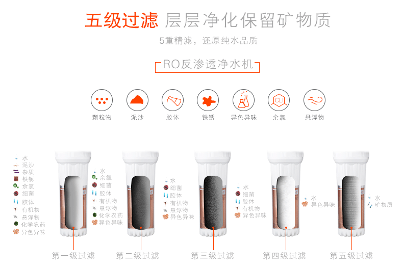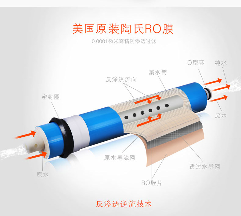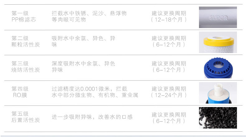濾芯:PP棉+UDF顆粒活性炭+CTO燒結(jié)活性炭+RO反滲透膜+T33后置活性炭濾